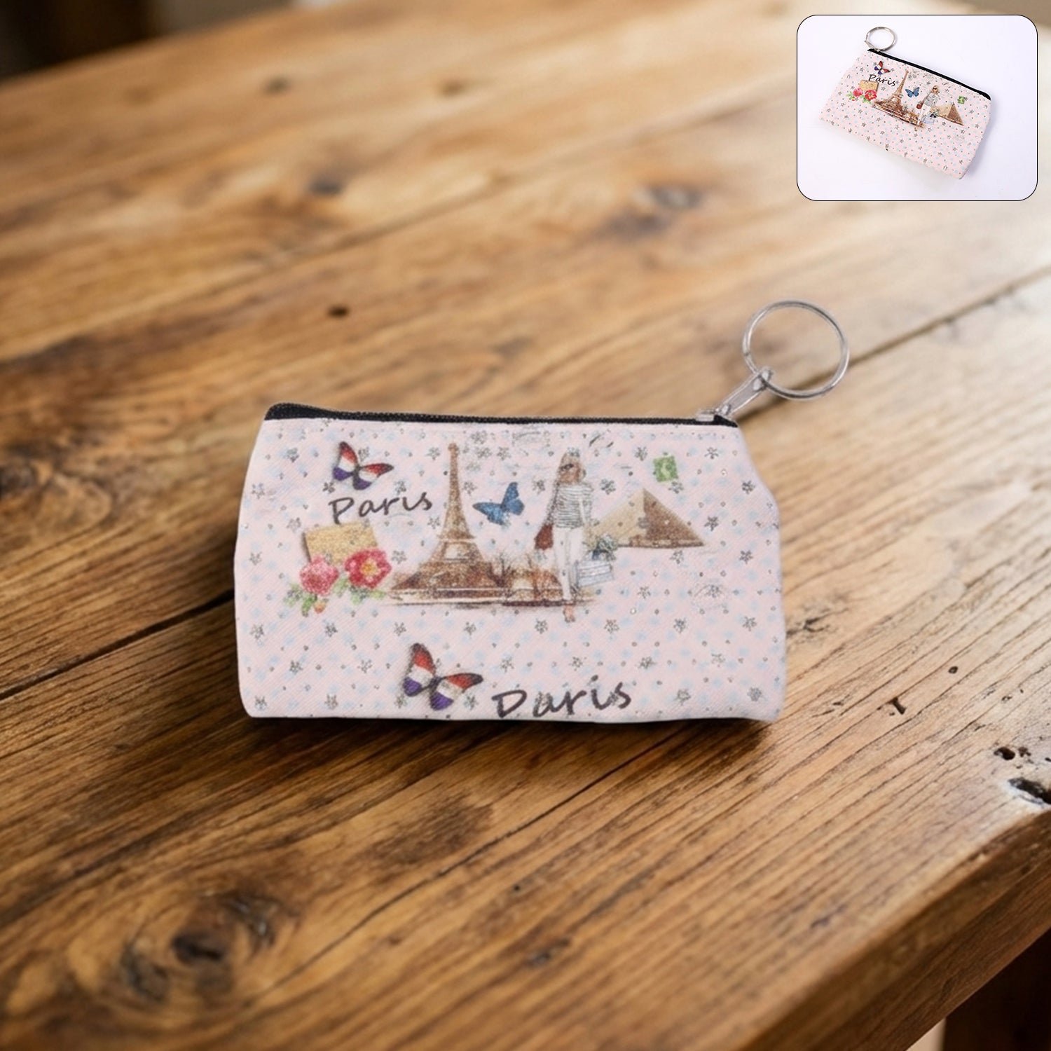 Small Paris Print Zipper Coin & Stationery Pouch with Key Ring – Compact Multipurpose Storage Pouch for Coins, Pens,...