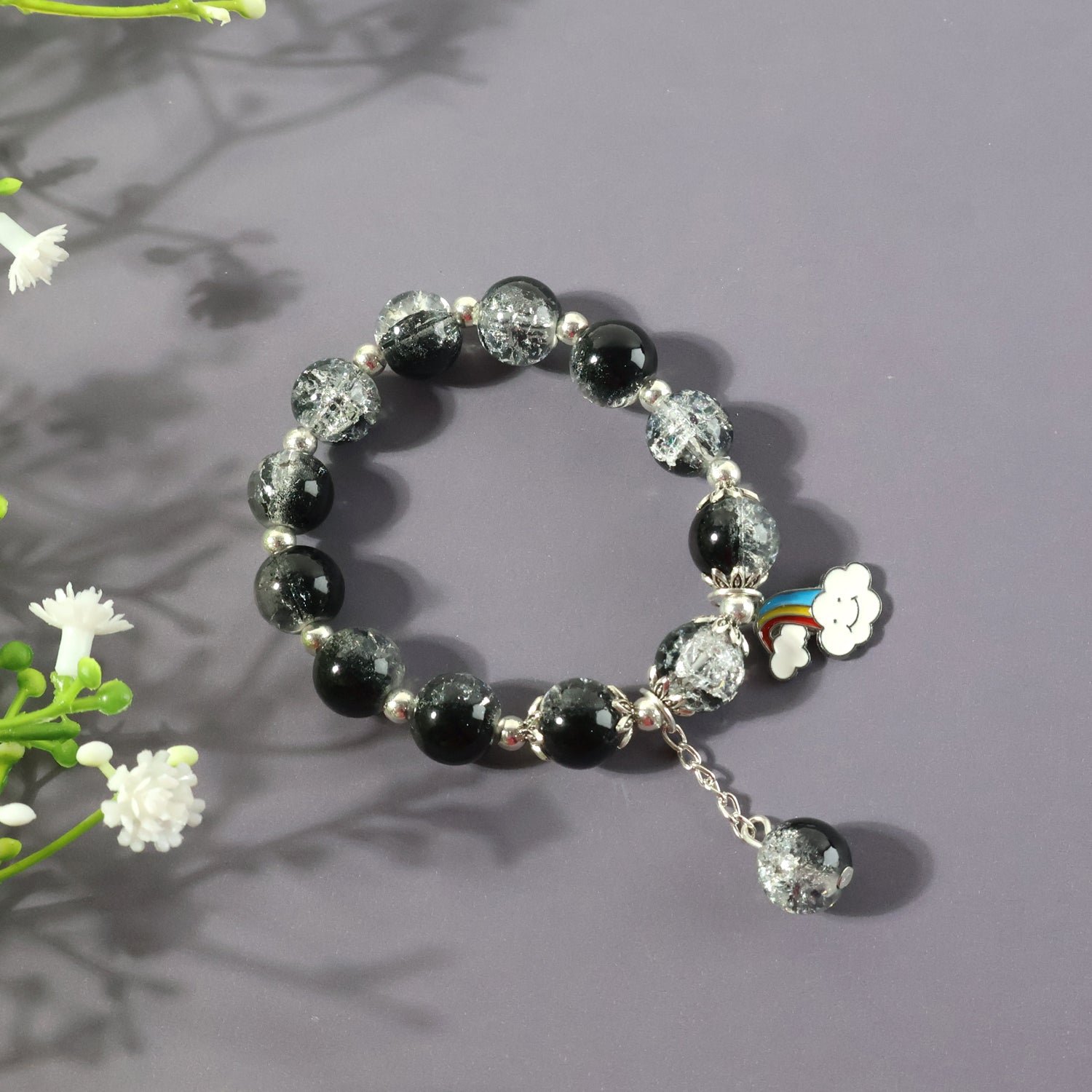 Elegant Black & Crystal Beaded Charm Bracelet with Cute Cloud & Rainbow Dangler for Women & Girls – Stylish...
